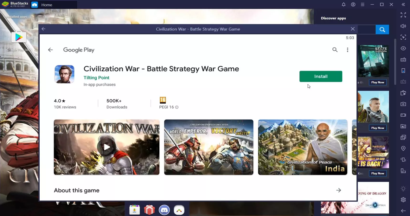"Civilization War" icon will appear on the desktop of this emulator, just click it in order to proceed to install. "Install" option will show up in the Google Play menu on your pc screen, just click on it. Now let your internet finish the installation process automatically.