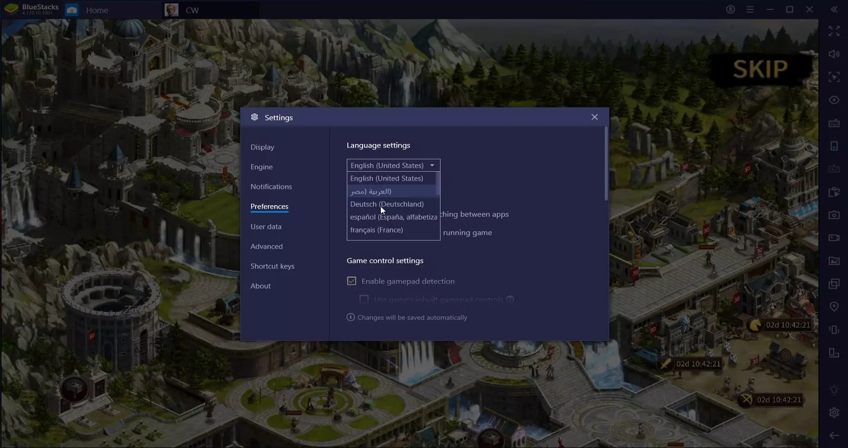 For those who like to convert the language of this emulator and the games, you should choose the cogwheel that we have in the bottom right corner. Firstly, head to Preferences, and then you are able to pick out any language from the "Language Configuration" menu. Finally, there you go!
