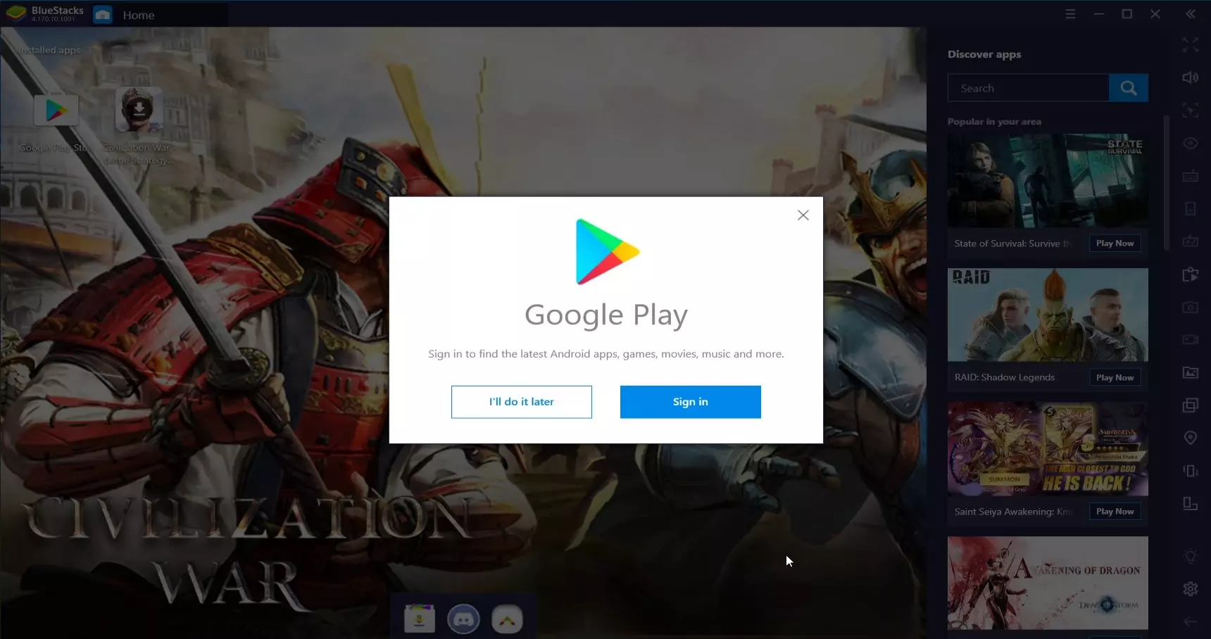 Instantly, Google Play opens, and we must log in. Therefore we begin Sign in, just click Sign in again and a screen will appear where we must enter our username and password of our Google account. If you will not sign in to Google Play you will not be able to have access to the Civilization War game on PC.