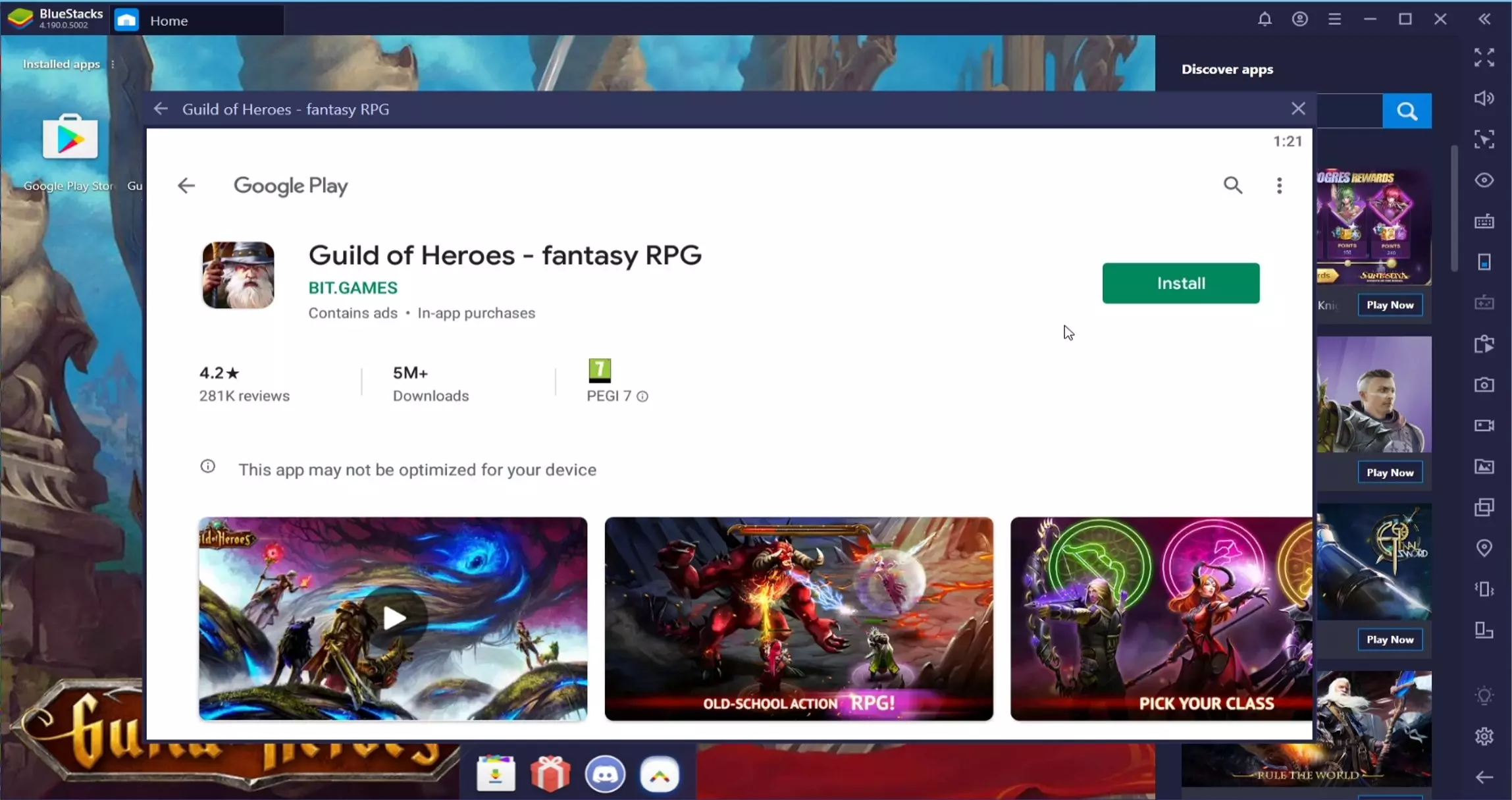 From Emulator's desktop, you have to hit this game icon which is "Guild of Heroes". "Install" button will show up in the Google Play menu on your computer screen, only press on it. If you have speedy internet then this downloading is going to be finished rapidly.