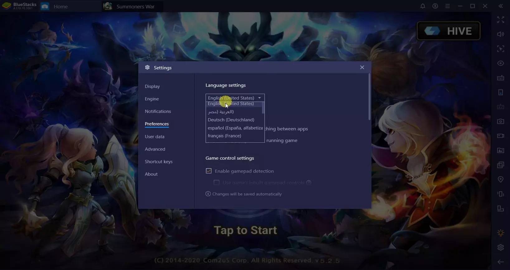 You can also alter the game language, and to do this, hit on this cogwheel. Now we check out Preferences, and in the drop-down menu of "Language Configuration," we simply select the language we want. Therefore we get it translated.