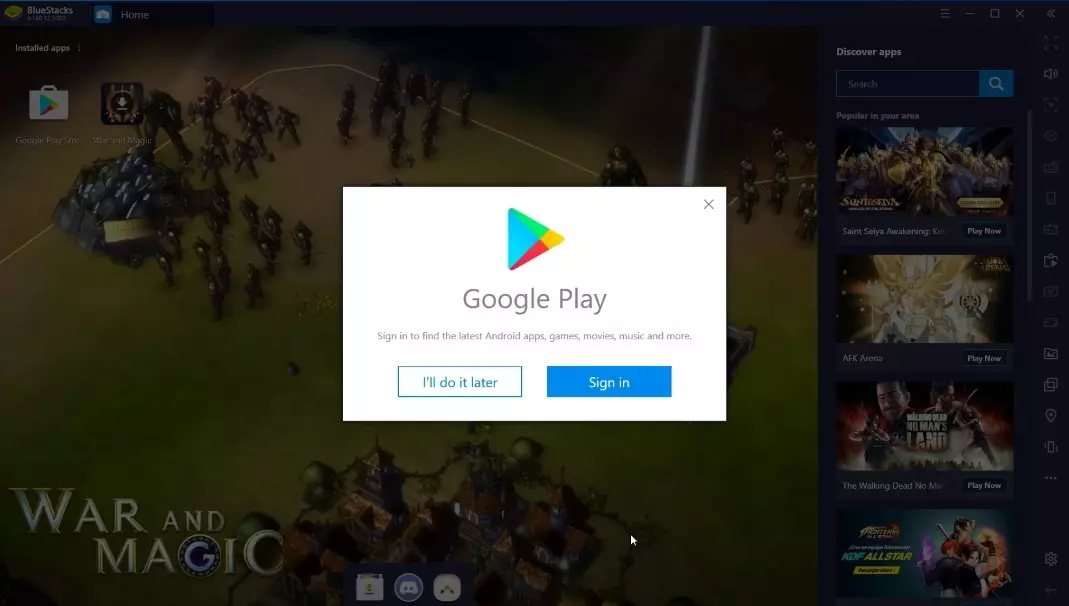 You will see "War and Magic" on the emulator's desktop, click on it to continue on installing. Google Play may appear on your computer screen and will request you to click on the "Install" option. Now the game is downloading and the speed depends on your internet connection.