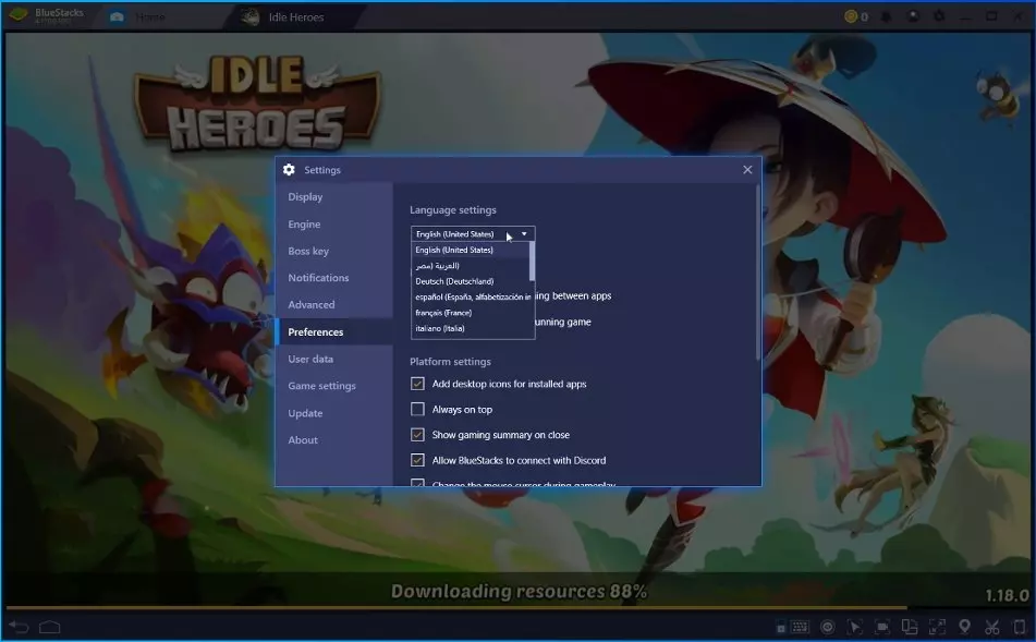 -  This step is optional and serves to translate the emulator and the games. In case we have it in another language, for example: if you have it in English and you want it in Spanish, click on settings, on the cogwheel, click again on settings, and in preferences, language settings, Spanish. We now have the BlueStacks interface in Spanish, in case we are interested in having it in Spanish.