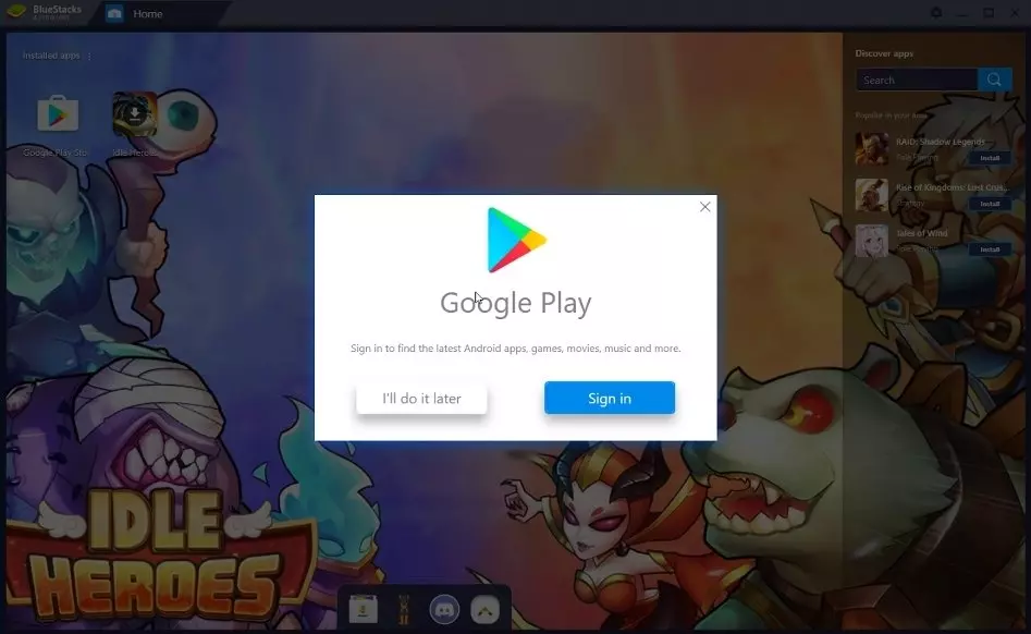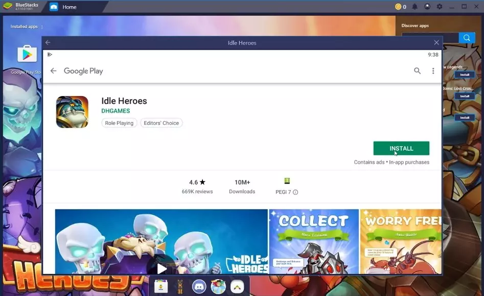 -  If Google Play is opened, we close it and go to the emulator desktop, and there we click on the Idle Heroes icon, and a new window opens where we must click on the "Install" button to start the game installation.