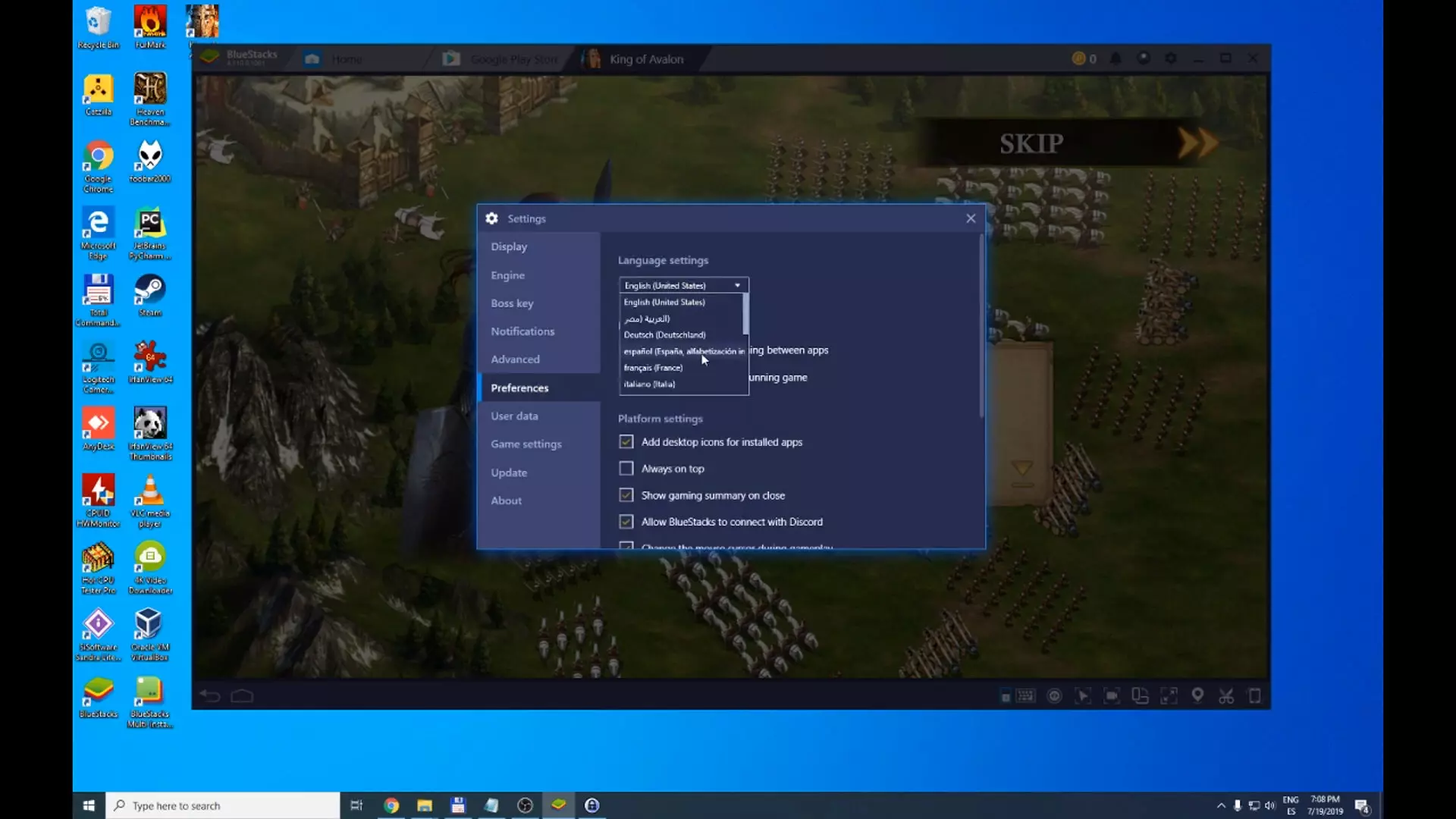 -  One last step for those who want to change the language of the emulator and the game. We click on the cogwheel at the top right. We click on Settings . We go to Preferences , Display , and select Spanish-Spanish International Alphabetization. We now have it in Spanish.
