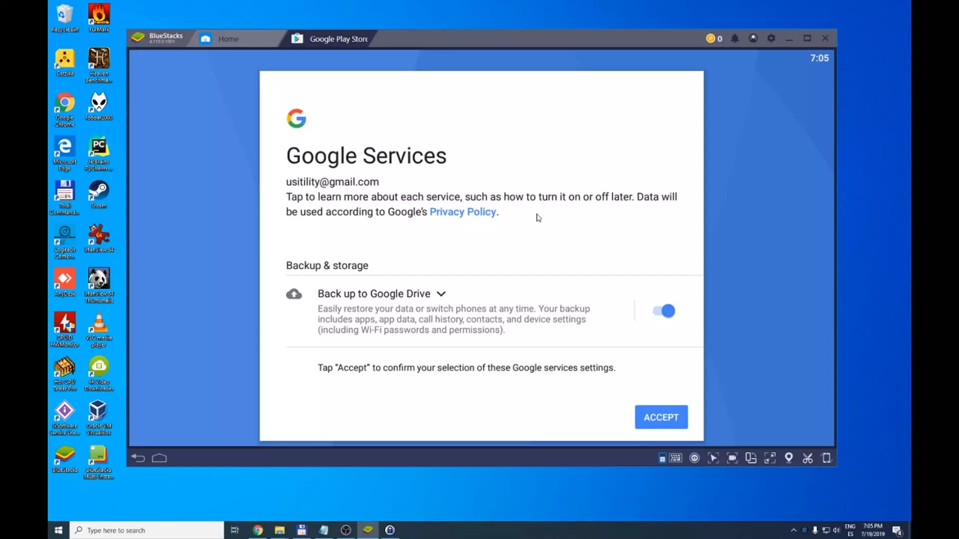 -  The installation has finished, and now we are in the emulator. Now it asks us to log-in with any Google account. Let's assume that we already have a Google account created, and we enter the account data: username and password.