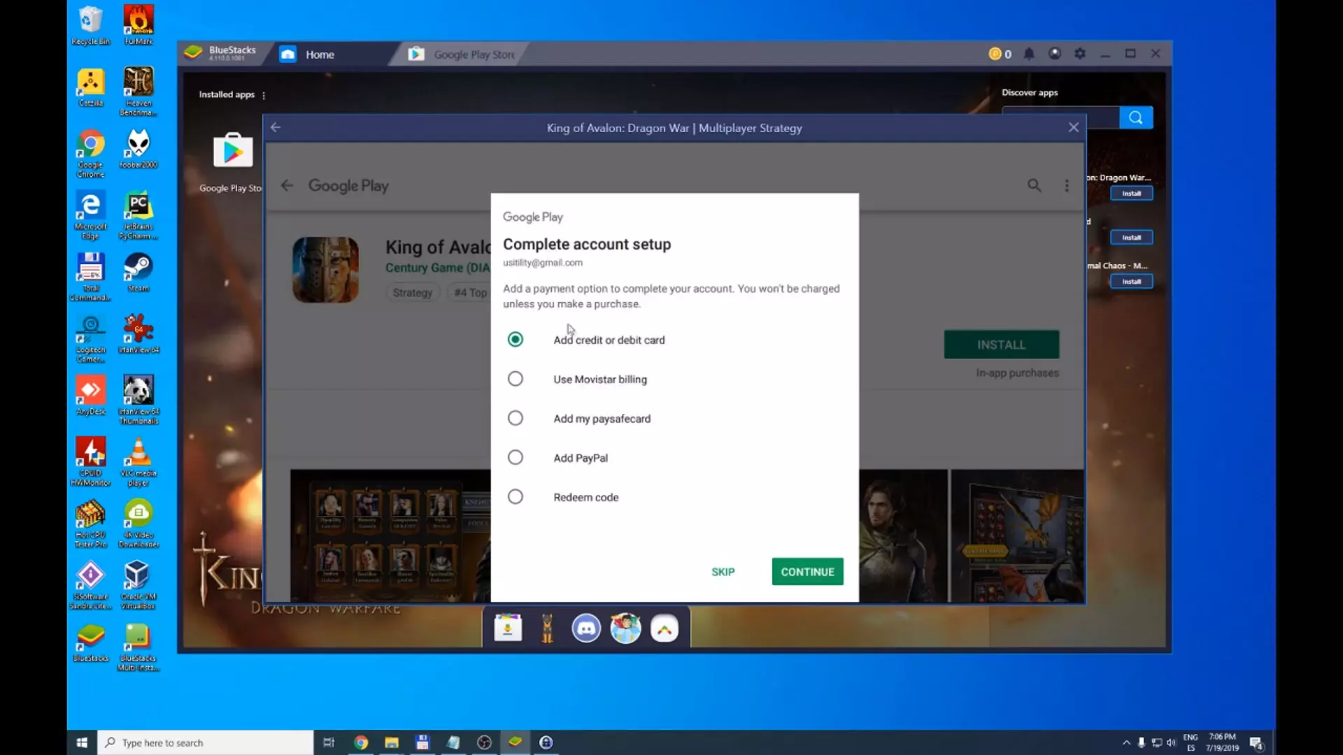 -  Finally, we have to complete our account information. This option is meant to choose your payment method, but we are not going to specify anything since we do not plan to buy anything. If you want to buy something in the games, you can add Paypal, credit or debit card, and other forms of payment. Let's click on the Skip button.