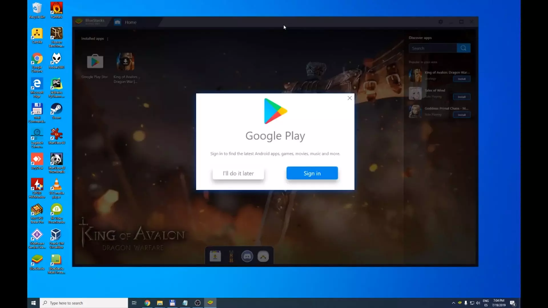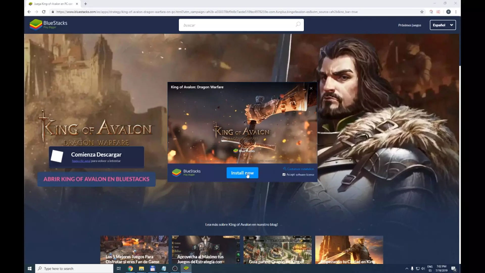 - We accept, and it automatically takes us to the Play Store, but remember that we have installed the BlueStacks, so to play the game, let's go to the home page, and here we see that we have the King of Avalon Dragon Warfare icon ready. We click on it, and it takes us to Google Play. There we click on " Install ".