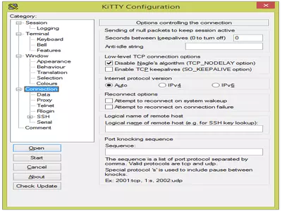 KiTTY hat alle Funktionen von PuTTY und fügt einige neue hinzu. KiTTY basiert auf PuTTY 0.63. Wir können uns also über SSH, telnet, oder den seriellen Port des Computers verbinden.