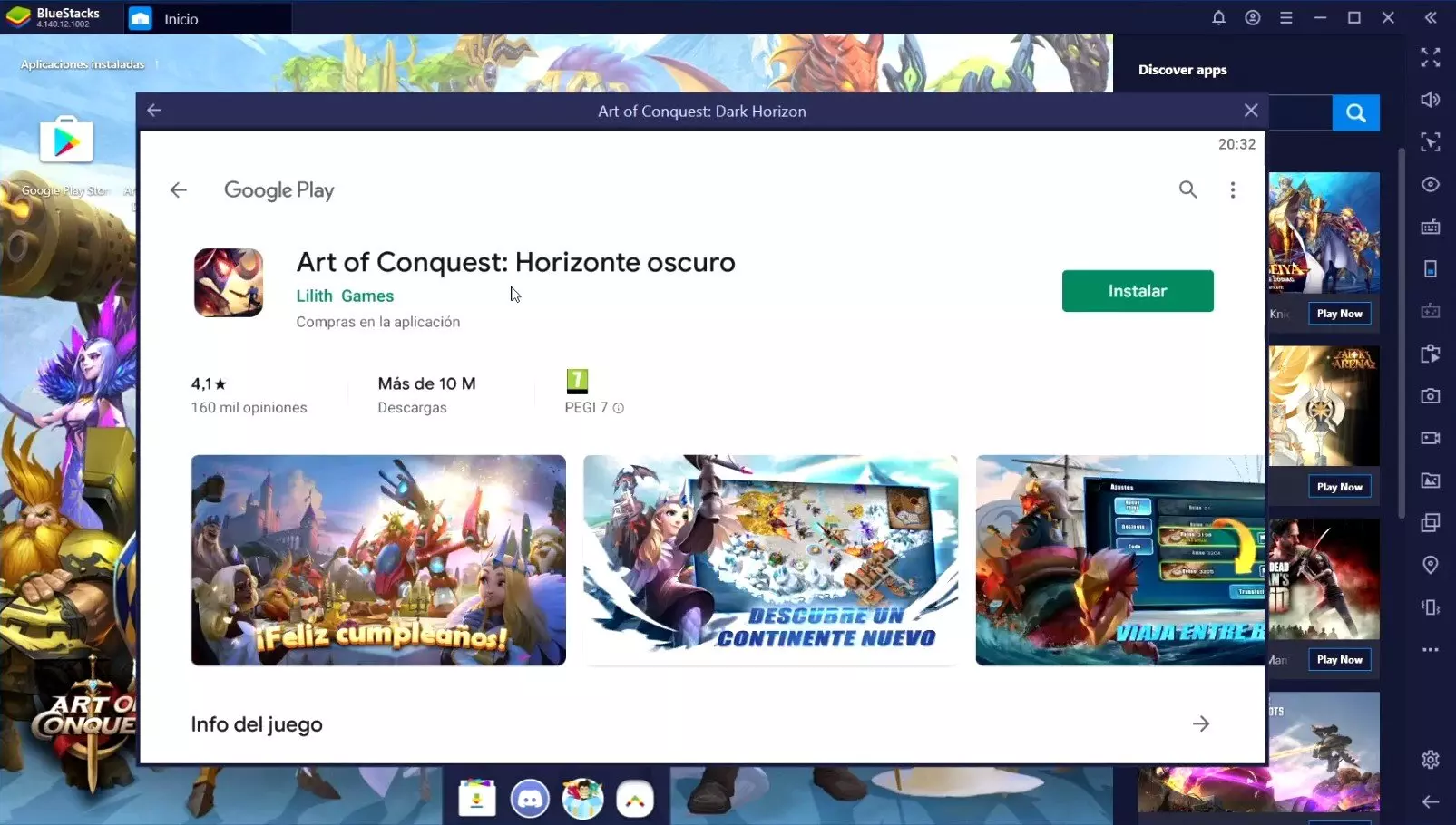 -  En el escritorio del emulador procedemos a la instalación pinchando en el icono del " Art of Conquest Dark Horizon ". Aparece de nuevo la Google Play y ahí hacemos click sobre el botón de " Instalar ". Comenzará la descarga del juego y depende de vuestra conexión tardará más o menos en descargarse.