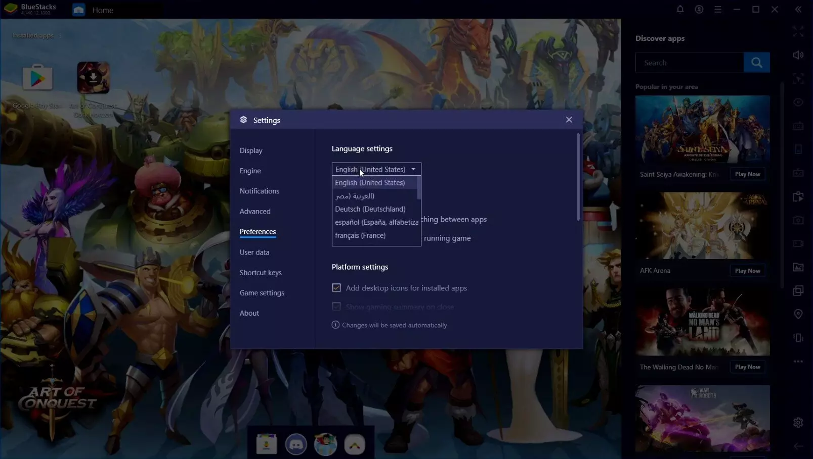 -  En caso de que queráis cambiar el idioma del emulador y los juegos, debéis pinchar sobre la rueda dentada que tenemos en la parte superior derecha. Ahora pinchamos en Preferencias , y en el desplegable de “ Configuración del idioma ” seleccionamos el idioma que queramos. Y ya lo tenemos traducido.