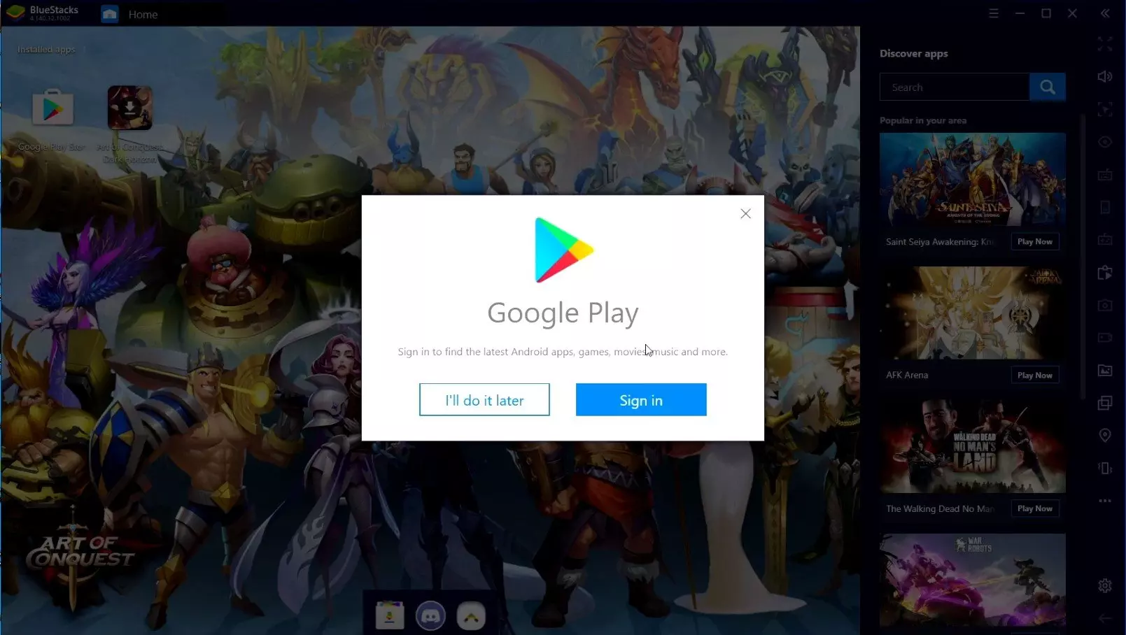 -  Automáticamente se abre la Google Play, y ahí tenemos que loguearnos. Así que iniciamos Sign-in, volvemos a pinchar Sign in y nos va a aparecer una pantalla donde tenemos que introducir nuestro nombre de usuario y contraseña de nuestra cuenta de Google. Esto es obligatorio, hay que hacerlo sí o sí, para poder jugar al Art of Conquest en nuestro PC Windows.