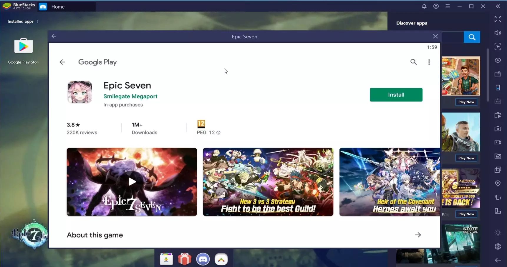 El icono "Epic Seven" aparecerá en el escritorio del emulador, haz clic en él para proceder a la instalación. Aparecerá Google Play de nuevo, y entonces elegiremos la opción "Instalar". La descarga de este juego comenzará, y dependiendo de tu conexión; va a tomar más o menos tiempo en descargarse.
