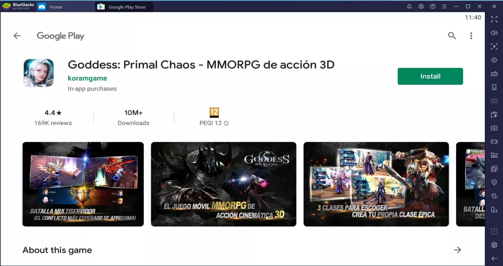 Desde el escritorio del emulador, tienes que pulsar el botón del juego que es " Goddess Primal Chaos". Y luego, verás el menú de Google Play una vez más, después de lo cual eliges el botón de "Instalar". La descarga de este excitante juego comenzará, y en función de tu conexión a Internet, necesitará más o menos tiempo para descargarse.