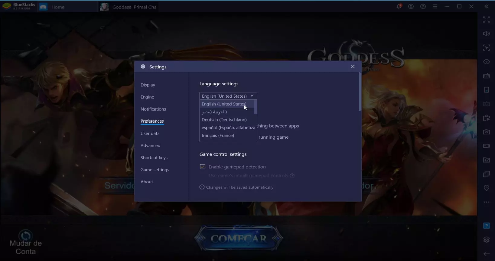 En caso de que quieras cambiar el idioma del emulador y de los juegos, tienes que elegir la rueda dentada que encontrarás en la esquina inferior derecha. Busca el idioma específico dentro de la lista desplegable de "Configuración del idioma" y, por lo tanto, selecciónalo. WOW, es bastante simple!