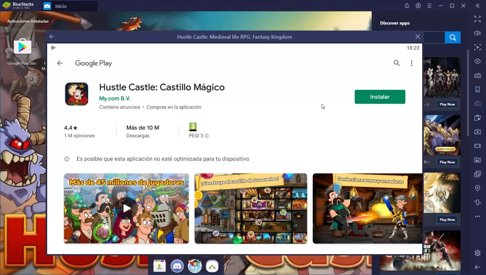 Verás "Hustle Castle Fantasy Kingdom" en el escritorio del emulador, sólo tienes que pulsar para proceder a la instalación. Google Play aparece una vez más, y luego elegimos la opción "Instalar". Ahora el juego se está descargando, y la velocidad depende de tu internet.