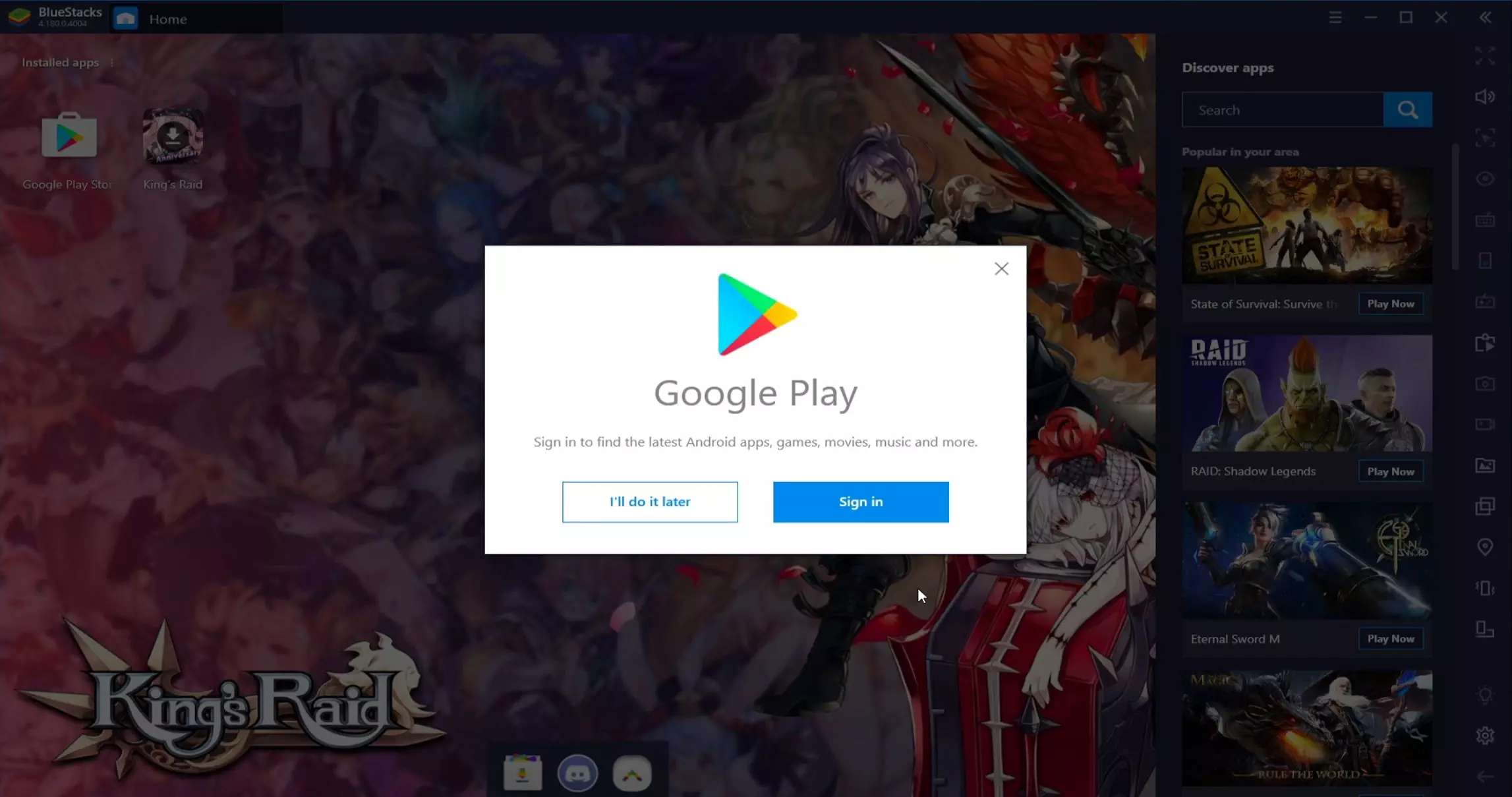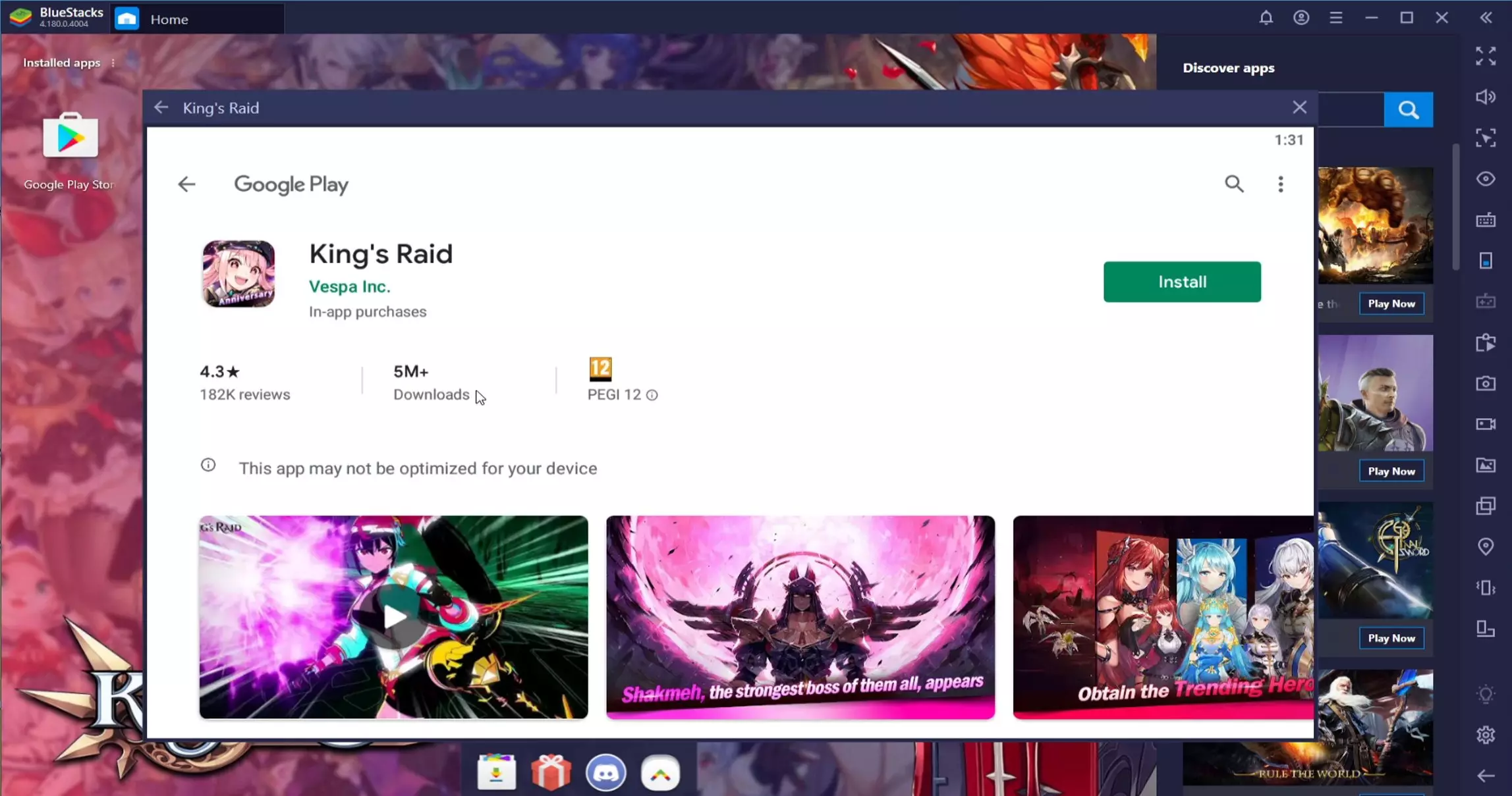 El icono de "King's Raid" aparecerá en el escritorio de este emulador, selecciónalo para proceder a su instalación. El botón "Instalar" aparecerá en el menú de Google Play en la pantalla de tu portátil, sólo tienes que pulsarlo. El juego se está instalando y la velocidad está determinada por tu conexión a Internet.