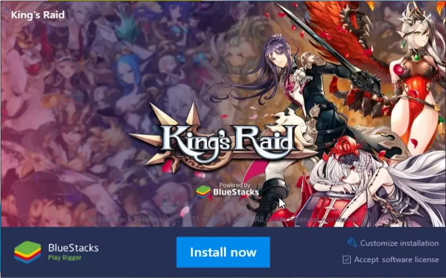 Aquí está la opción de "Descarga de King's Raid en PC", haz clic en ella. Encontrarás un archivo titulado BlueStacksInstaller.exe en las descargas de tu ordenador.