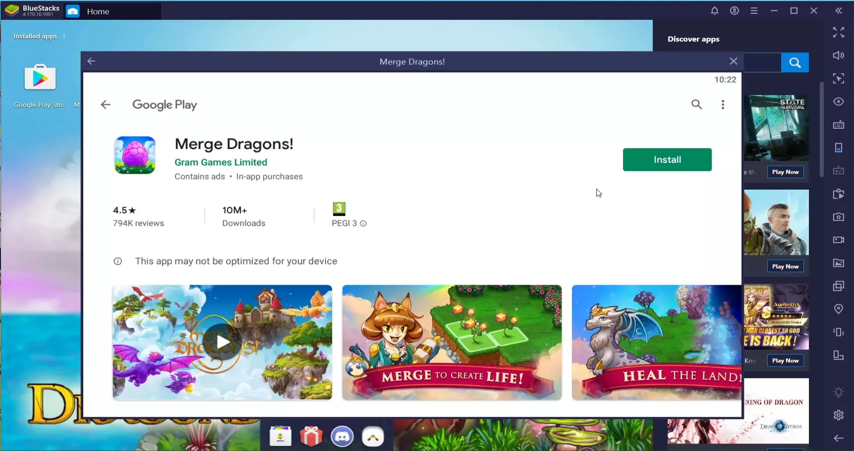 Verás "Merge Dragons" en el escritorio del emulador, haz clic en él para continuar con la instalación. El botón "Instalar" aparecerá en el menú de Google Play en la pantalla de tu portátil, simplemente pulsa sobre él. Ahora sólo deja que tu conexión a Internet complete el procedimiento de descarga automáticamente.