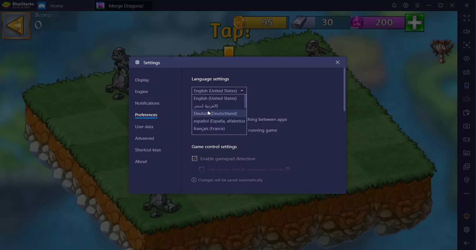 Incluso puedes cambiar el idioma del juego, y para ello, haz clic en esta rueda dentada. Ahora revisamos las Preferencias, y luego en la lista desplegable de "Configuración del idioma", encontramos el idioma que queremos. WOW, es bastante simple!