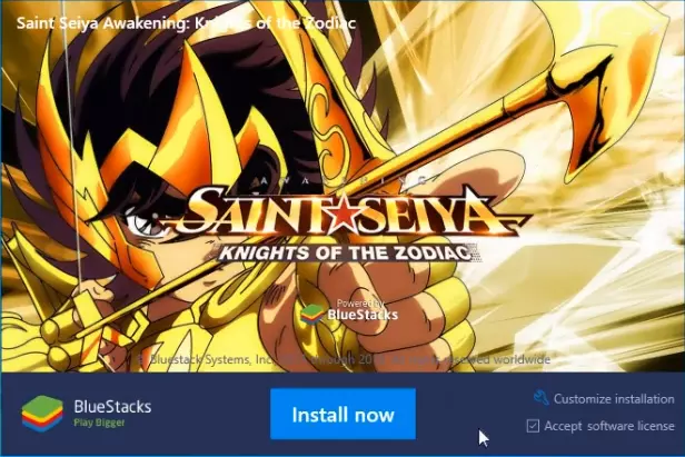 - Después de unos minutos, se lanzará el emulador BlueStacks, con una imagen de fondo del juego de Los Caballeros del Zodiaco.