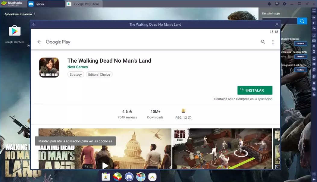 Verás "The Walking Dead No Mans Land" en el escritorio del emulador, pulsa sobre él para que puedas seguir instalando. Google Play aparece de nuevo y elegimos la opción "Instalar". Para aquellos que tengan una conexión rápida a Internet esta instalación se completará rápidamente.