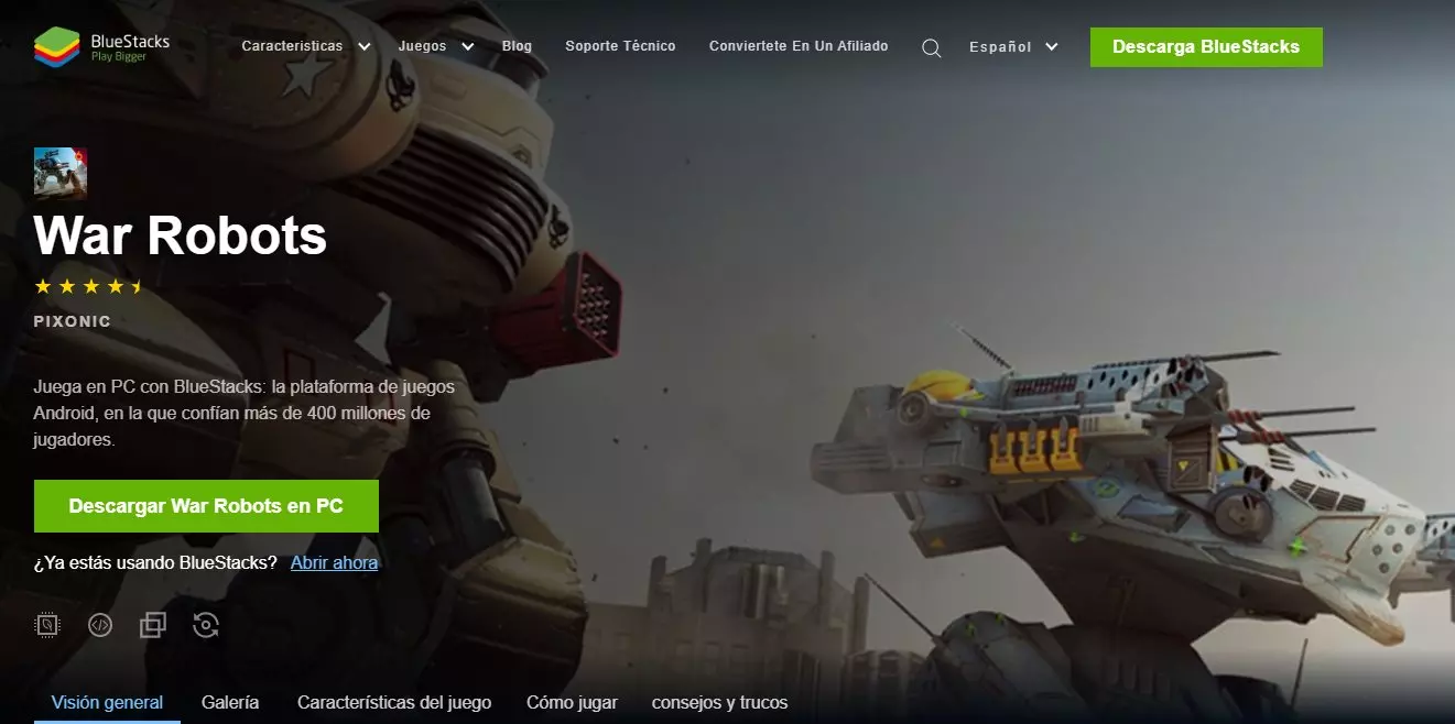Ahora tenemos que hacer clic en el botón "Descargar War Robots en el PC". El archivo que se ha guardado es el BlueStacksInstaller.exe.