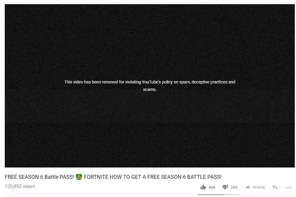 En YouTube existían vídeos que ofrecían pases gratis para la temporada 6 de Fortnite, además de ofrecer paVos gratis para comprar contenido adicional del juego, también ofrecían hacks para hacer trampas en el juego y conseguir por tanto ventaja en en esta recién comenzada temporada de Fortnite Battle Royale.