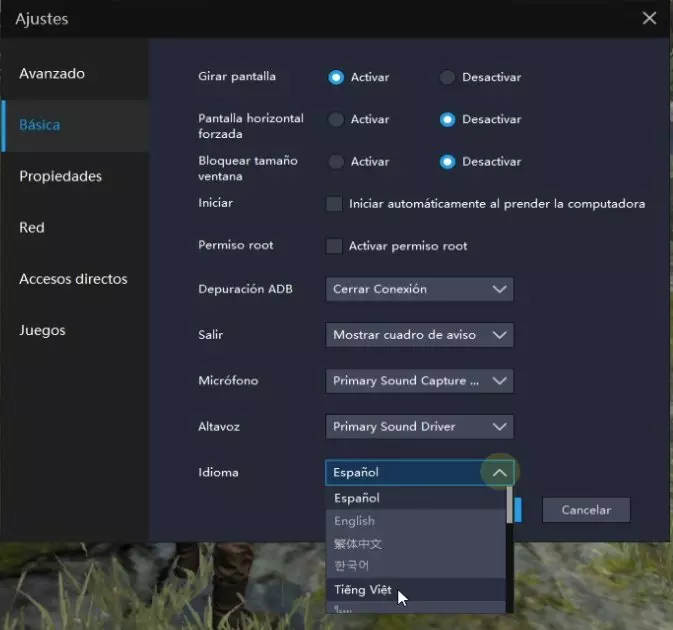 - El lenguaje por defecto del juego está en el idioma de Windows. Si lo necesitas, puedes modificar el idioma por cualquier otro. Para ello, tienes que ir a la rueda dentada y a las Preferencias . Aparecerá un menú desplegable donde podrás decidir el idioma preferido. Tanto el emulador como el juego se ajustarán al idioma elegido.
