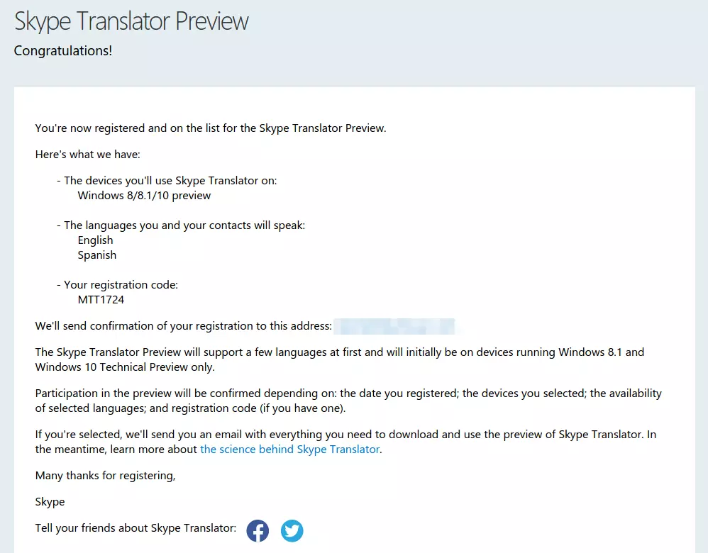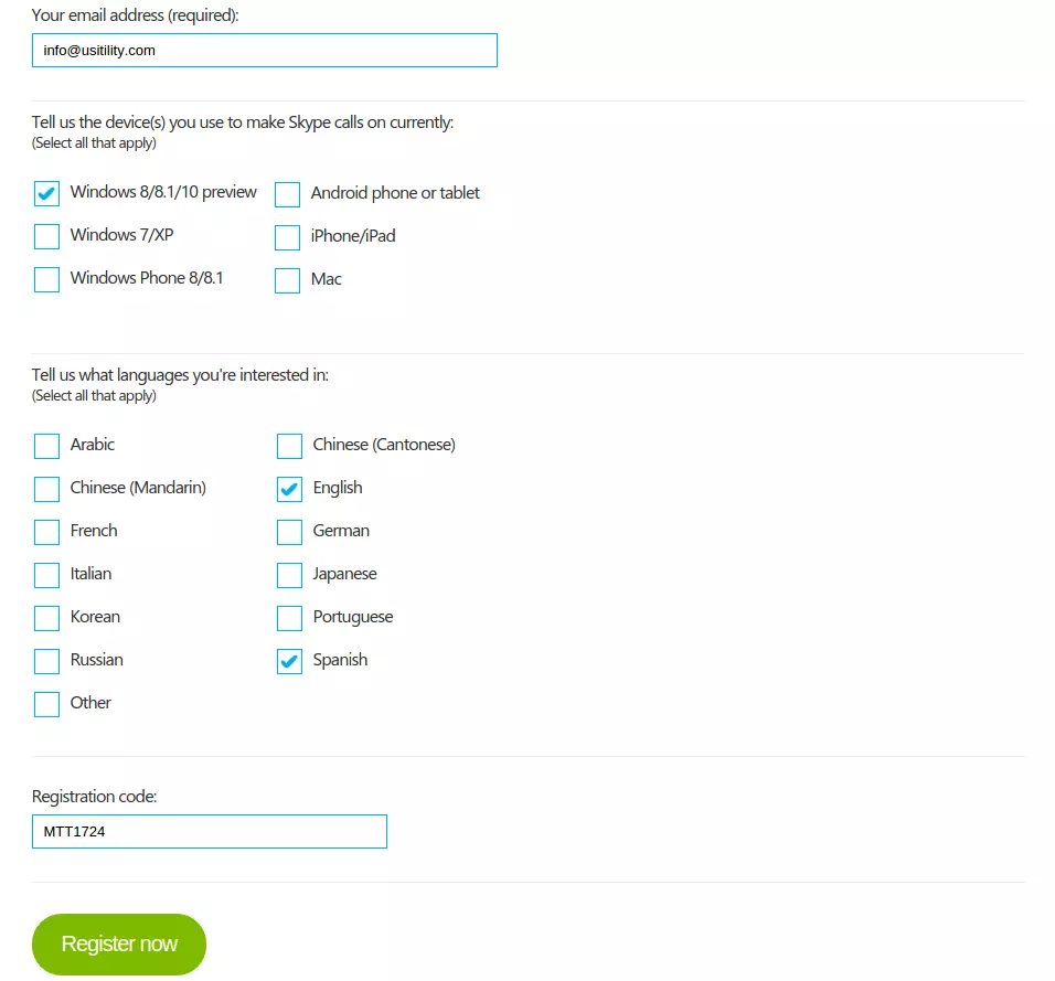 Esta función no está disponible en Skype aún. Si queremos probarla debemos inscribirnos al programa de Skype Translator Preview, que es gratuito y está limitado a un cierto número de personas. Para inscribirnos debemos is a la siguiente web, rellenar los datos y pulsar sobre “ Register Now ”. Si introducís el código MTT1724 en la casilla de “ Registration code ”, tendréis más posibilidades de que os acepten en el programa y os envíen una copia de Skype para que probéis esta nueva función.