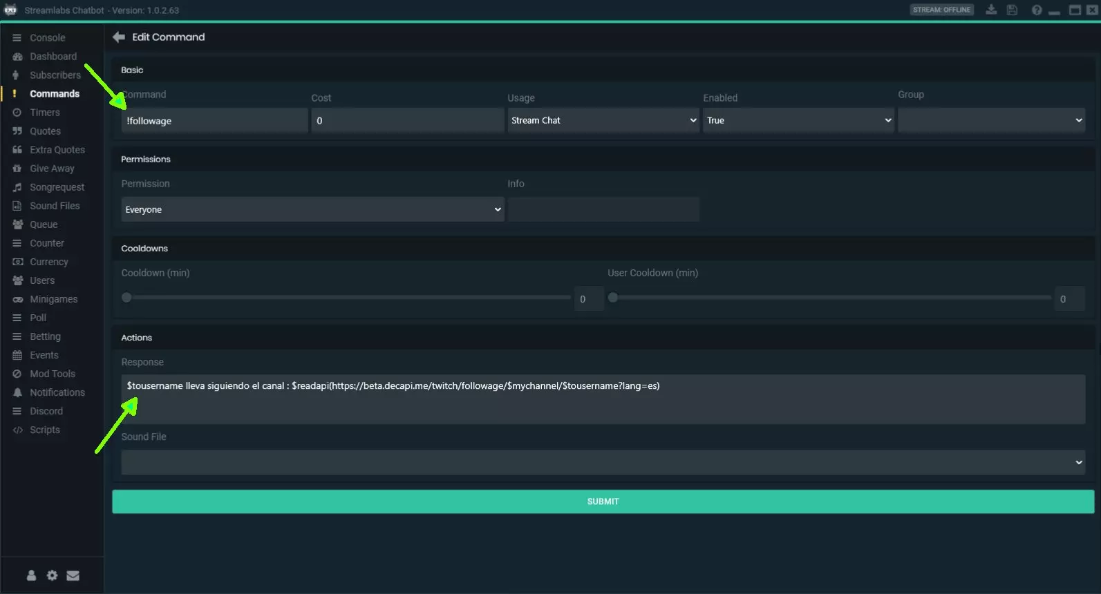 A continuación veremos una lista de comandos que nos serán útiles en nuestros streams de Twitch o YouTube. Los únicos datos que son necesarios rellenar en el bot son Command y Response. Como se ve en la imagen siguiente, que muestra la configuración del comando !followage.