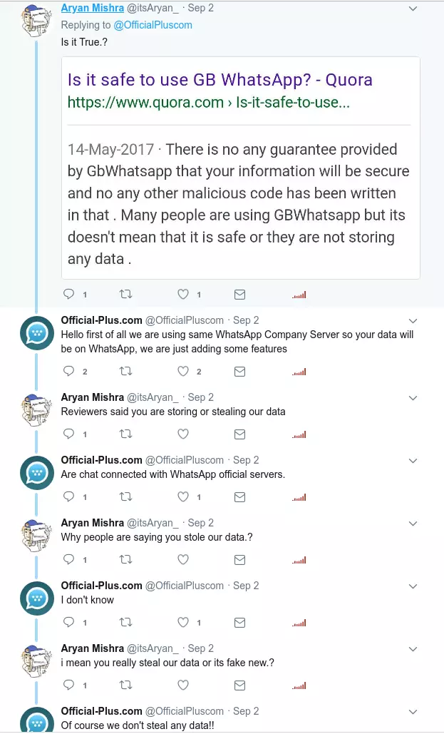 Otra duda que se ha planteado en el twitter oficial de esta app, es la de si estaban robando los datos de los usuarios de la aplicación. A lo cual, los desarrolladores han respondido que obviamente no roban ni almacenan ningún tipo de dato de los usuarios de la app, ya que esta aplicación hace uso directo de los servidores oficiales de WhatsApp, sin pasar por ningún servidor intermedio: