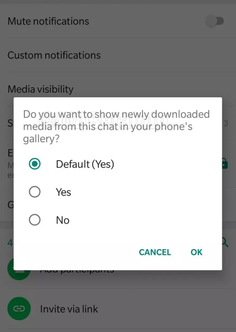 Esto quiere decir, que por defecto, todos los chats y grupos del WhatsApp mostrarán los ficheros multimedia en la galería de nuestro teléfono. Si queremos que no se muestren dichos ficheros multimedia en la galería de imágenes, debemos seleccionar la opción de "No".