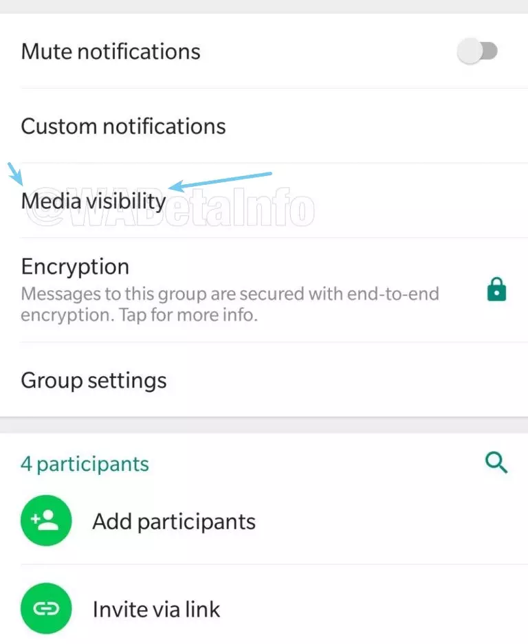 Pues bien, está versión de WhatsApp incorpora la funcionalidad de ocultar en la galería de nuestro Android, los ficheros multimedia compartidos por WhatsApp. Esta configuración se puede aplicar a cualquier chat, y grupo de WhatsApp. Por ejemplo, en la siguiente imagen se puede ver como en las propiedades de un grupo, aparece la nueva opción de "Media visibility" (visibilidad de ficheros multimedia):