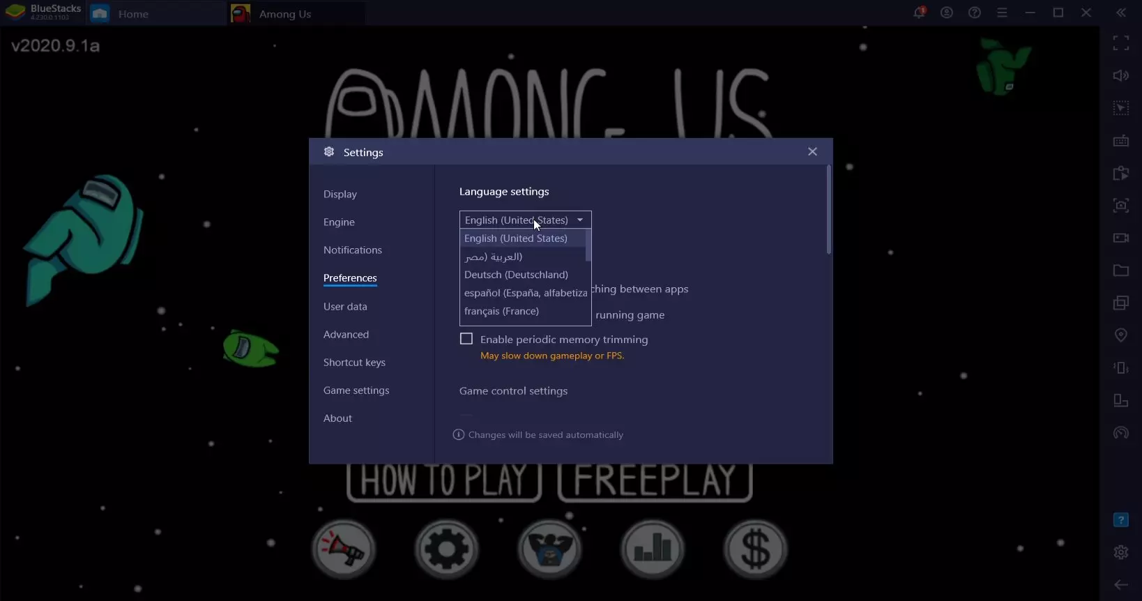 - La langue du jeu par défaut est la langue de Windows. Si vous le souhaitez, vous pouvez changer la langue en choisissant toute autre langue. Pour ce faire, vous devez aller à la roue dentée qui apparaît en bas à droite de l'émulateur, et vous rendre dans la rubrique Préférences. Là, un menu déroulant apparaîtra où vous pourrez choisir la langue souhaitée. L'émulateur et le jeu seront tous deux dans la langue choisie.