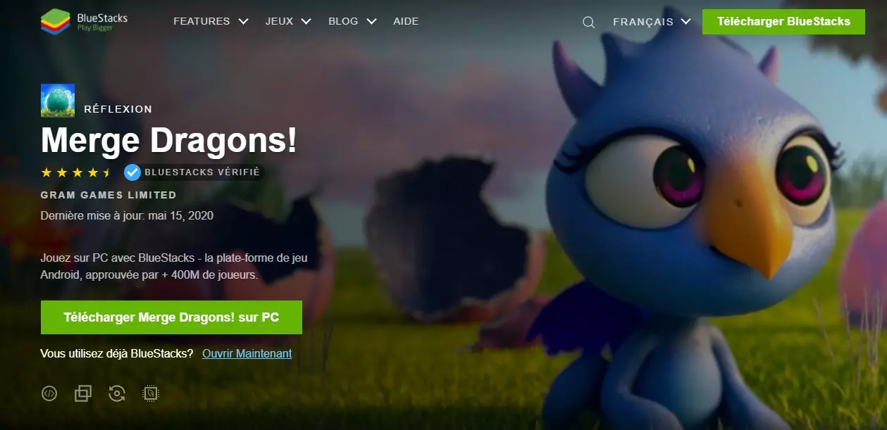 Lorsque vous êtes sur le site web de Bluestacks, vous trouverez le bouton « Télécharger Merge Dragons sur PC ». Le fichier téléchargé est le suivant : BlueStacksInstaller.exe.