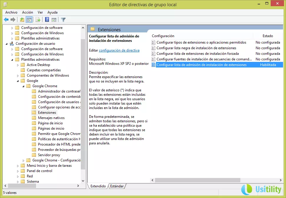 Une nouvelle fenêtre s'ouvre et sur le côté gauche, allez sur : Configuration de l'utilisateur -> Modèles d'administration -> Google -> Google Chrome -> Extensions_.