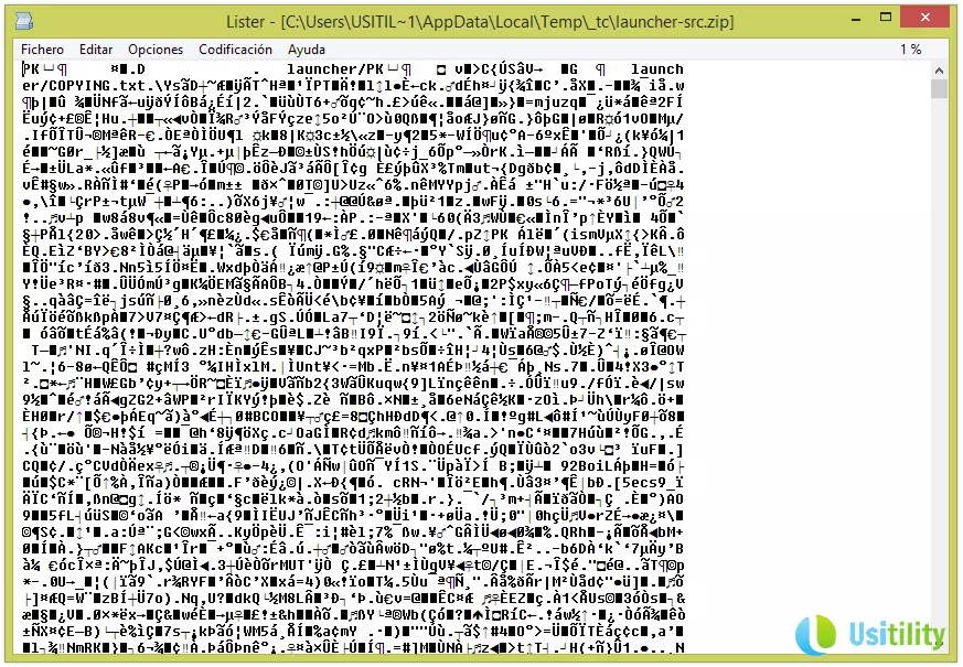 Note : La touche F3 est utilisée pour prévisualiser le contenu de tout fichier, quelle que soit l'extension du fichier. On peut donc lire le contenu des fichiers .nfo, .ini, cfg, ou sans extension. Vous pouvez même visualiser le contenu des fichiers .exe, ou .zip (ou tout autre fichier), bien qu'évidemment la seule chose que vous verrez soit une série de caractères sans aucun sens. Regardez l'image ci-dessous pour vous en convaincre.