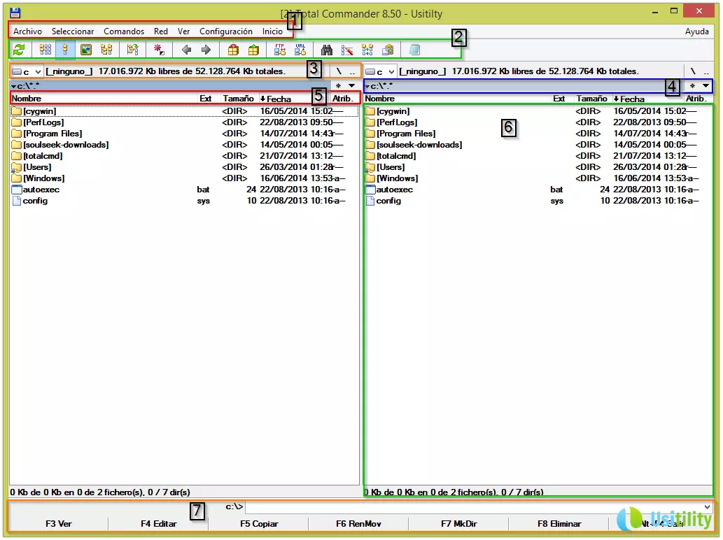 Nous avons divisé l'interface de Total Commander en 7 zones spécifiques. Voir la capture d'écran ci-dessous pour voir chacune des zones.